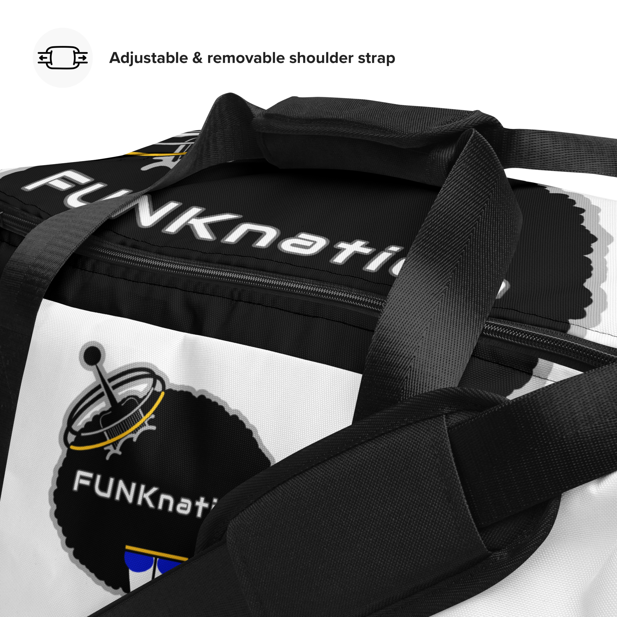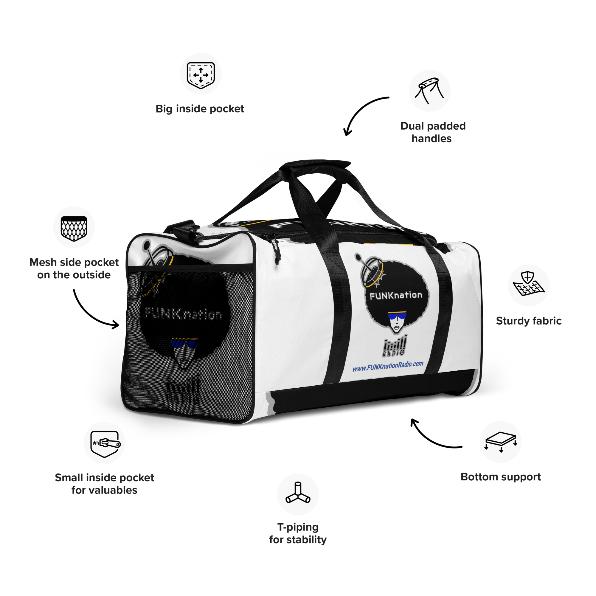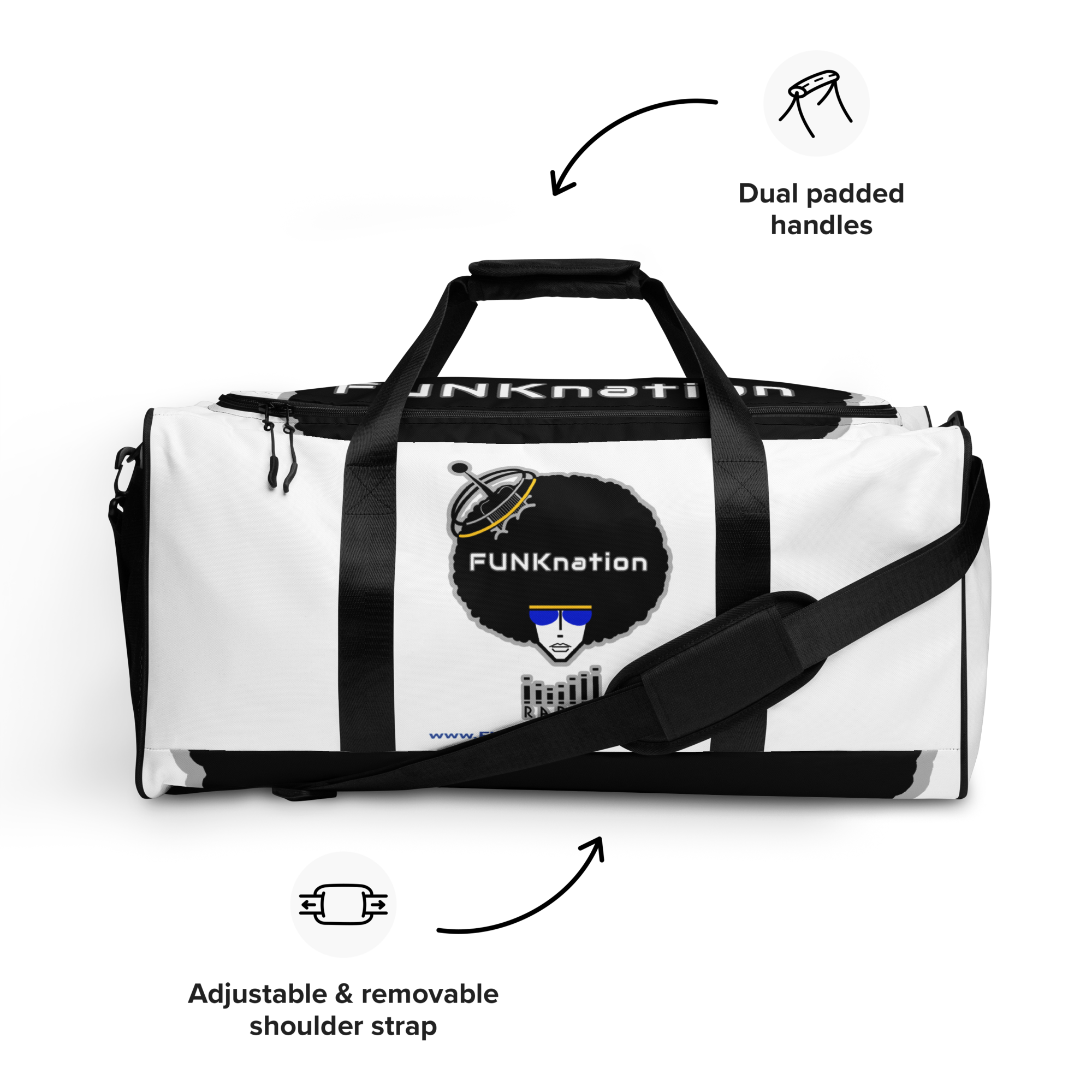 The FUNKnation Radio duffle bag is the perfect companion in the passenger seat or trunk of your car—take it with you when traveling, running daily errands, or going to the gym.